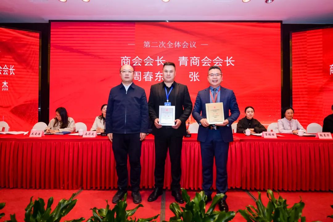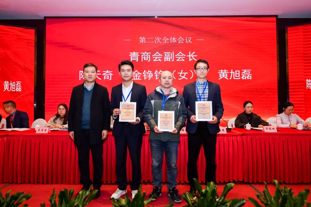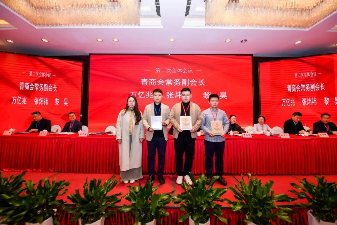 南桥镇第三届青年商会常务副会长万亿兆为青商会秘书长余晶颁发聘书;南桥镇第六届商会会长周春东为商会秘书长曹琦婷颁发聘书。